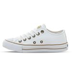 Forrería hecha 100% de algodón color blanco. Plantilla extraíble confeccionada en caucho moldeado y base textil. Cordones de algodón blancos. Etiqueta logo color suela en lengua. Ojalillera color bronce. Suela exterior y banda de caucho vulcanizado