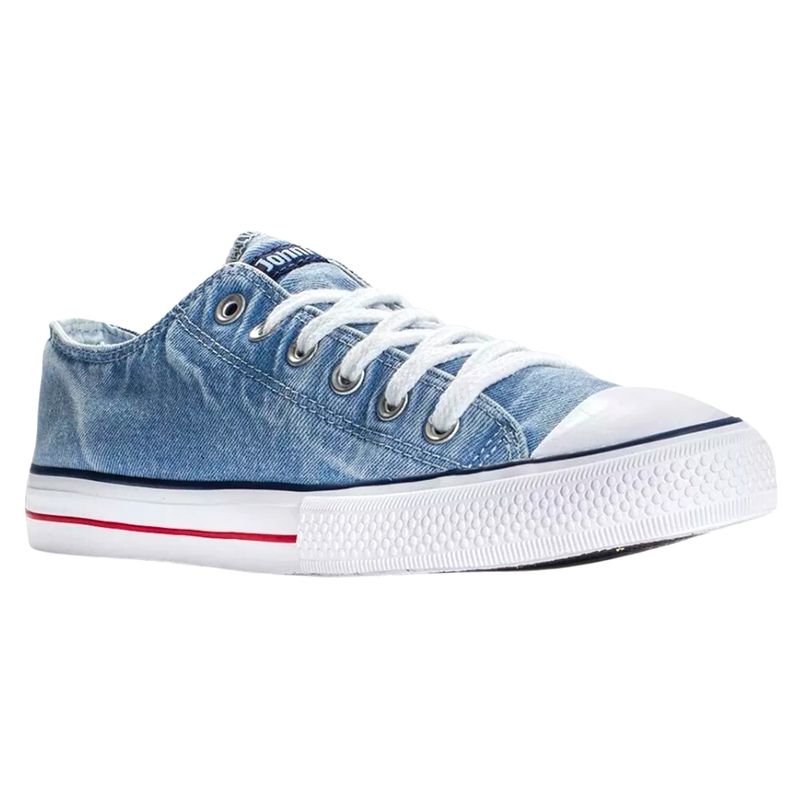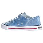 Zapatilla clásica unisex en denim azul con proceso de lavado laser suave.Forrería de algodón y contrafuerte de goma de caucho con base textil.